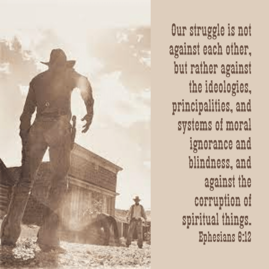 Our struggle is not against each other, but rather against the ideologies, principalities, and systems of moral ignorance and blindness, and against the corruption of spiritual things (Ephesians 6:12, paraphrase mine).