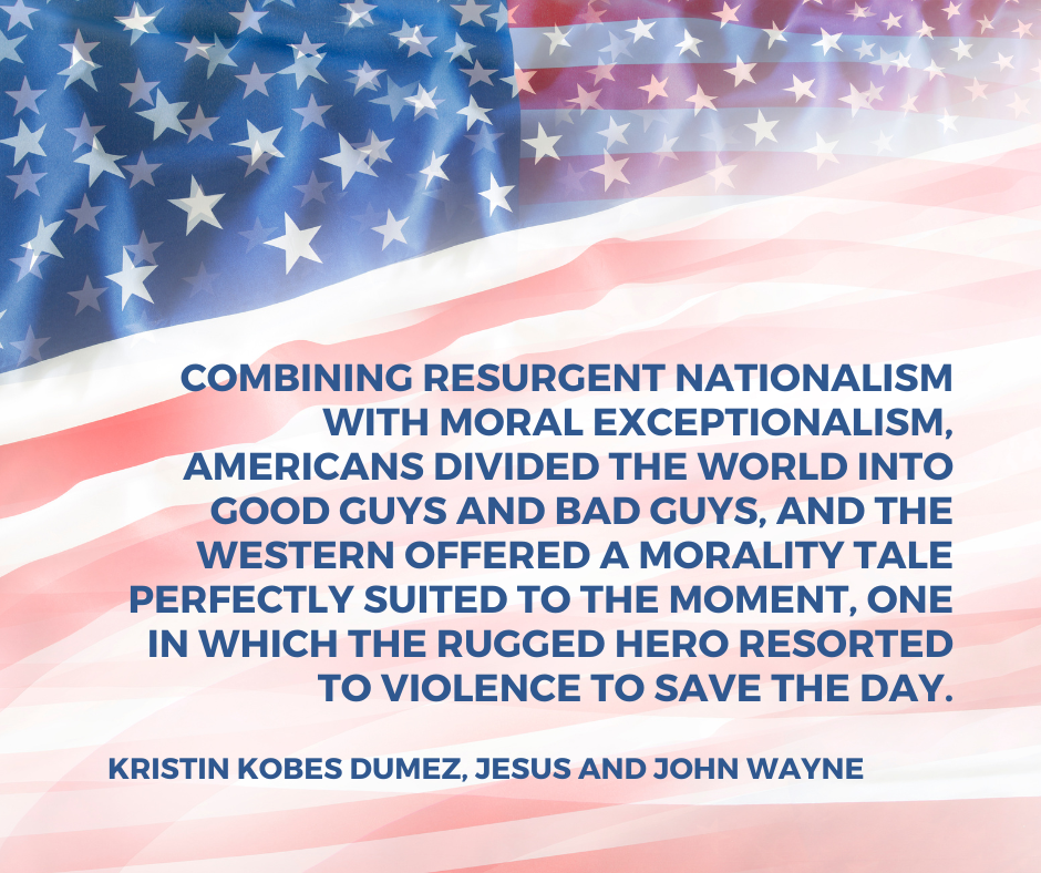 …yes, it also held more than its fair share of cringe and pain. Westerns reflect a number of America’s myths about ourselves and our origins—many of them historically inaccurate, racist, exclusive, misogynistic (I swear, horses are better represented than women), or all of the above. The classic Western centers around a cowboy-hero taking matters into his own hands to save society (by which he always means the vulnerable white settlers). As films grew more sophisticated, revisionist westerns challenged the classic notions of black hat v.s white hat/good vs. evil—a perspective which gained some honesty, but inadvertently undermined the credibility of the genre as a whole. Then neo-westerns tried to bring it back by keeping the setting and themes while removing some of the problematic elements from before, with only limited success. The legacy of classic westerns looms over us still, and as Kristin Kobes DuMez’s Jesus and John Wayne so thoroughly details, the archetypes they represent persist today in unhealthy role models for leaders and misappropriated nostalgia for bygone eras.